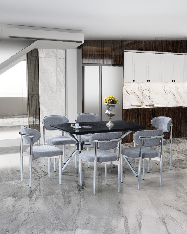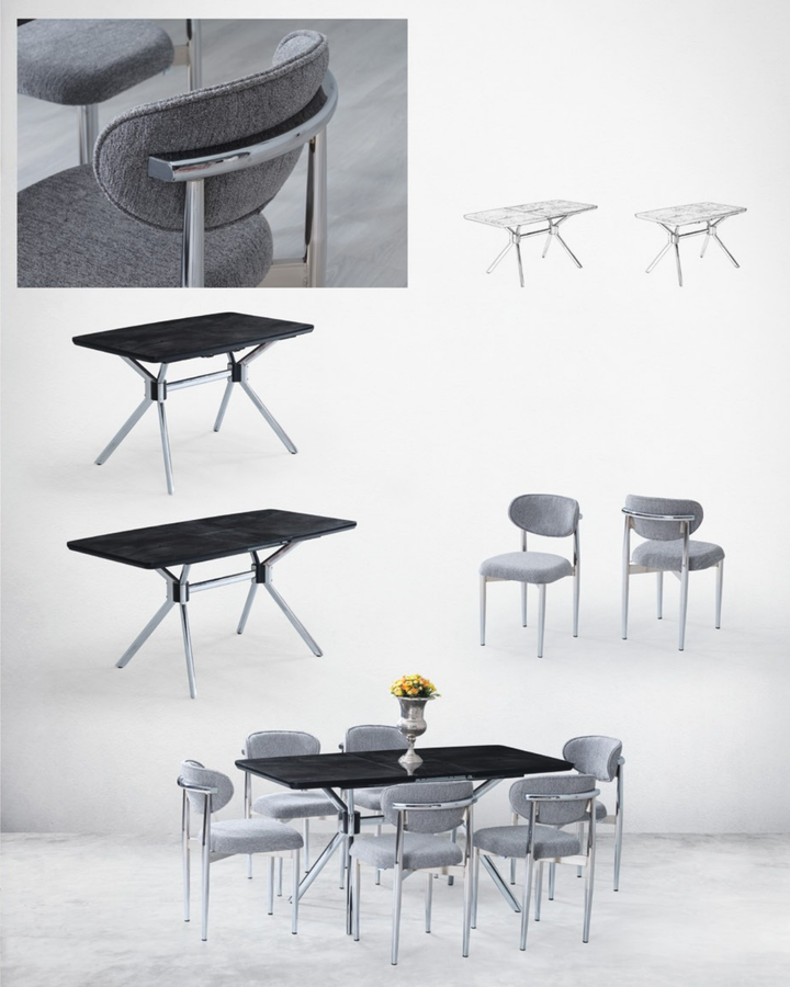 Gümüş metal ayak detayı, şık ve zengin bir görsellik kazandıran mermer yüzeyi ARNO GÜMÜŞ takımı eşsiz kılıyor