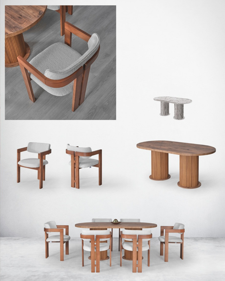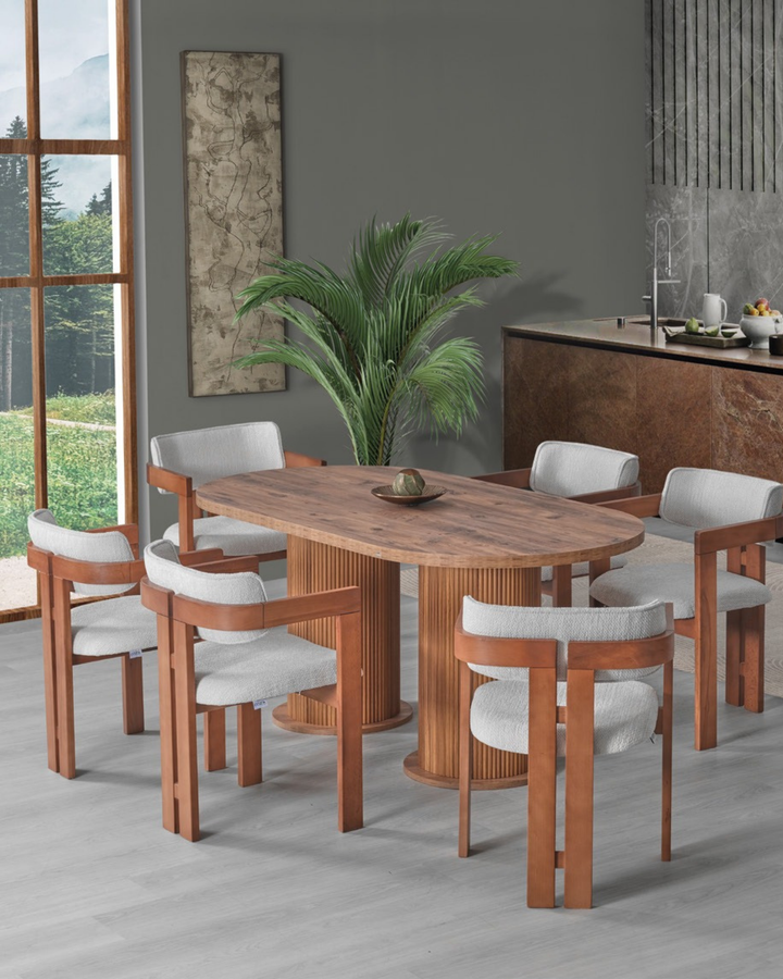 Zarif çizgileriyle dikkat çeken Valens Set, ceviz rengi ve ahşap deseni ile göz kamaştırıyor. Valens Set; oval tablasıyla dikkat çeken masası, rahat oturumu olan sandalyeleri, şıklığı ve zerafeti evinize taşıyor.